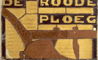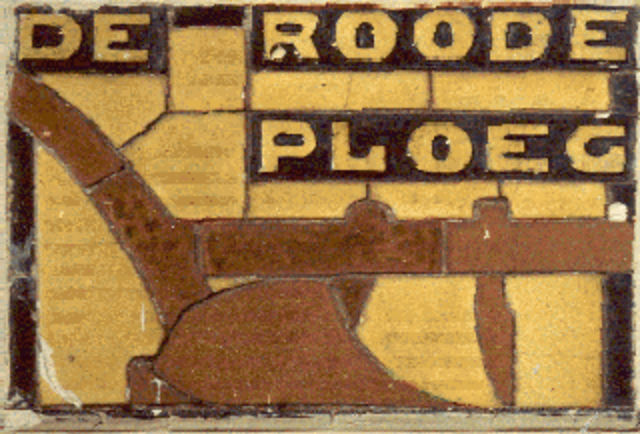 Boven de luifel van De Roode Ploeg zijn links en rechts twee keramische gevelsteentjes aangebracht, in gele letters op een zwarte achtergrond staat "DE ROODE / PLOEG".